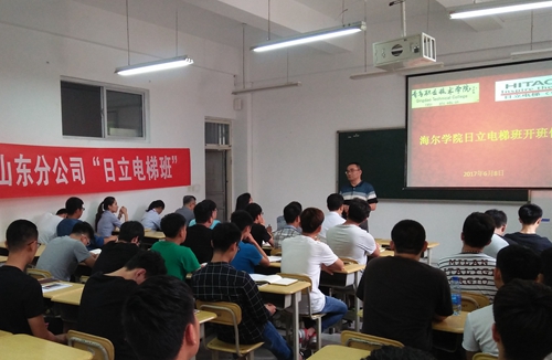 6月9日下午,海尔学院与日立电梯(中国)有限公司山东分公司联合成立的“日立电梯班”在致用楼举行开班仪式。日立电梯青岛分公司工程副总张延彬、山东分公司人力资源经理张丽雅、青岛分公司管理科长于贝贝,海尔学院院长张明耀、党总支书记费晓玉、机电专业部主任赵秋玲、电气专业部主任刘峰、从业工作负责人贾春刚及培训班全体同学参加了开班仪式。