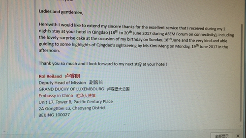 卢森堡大使馆副馆长对孟婉莹的表扬