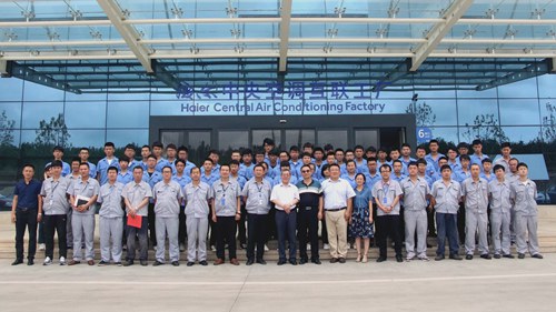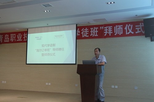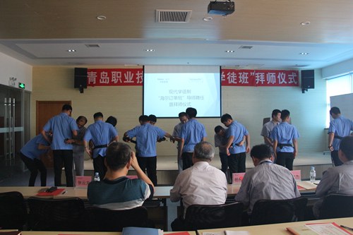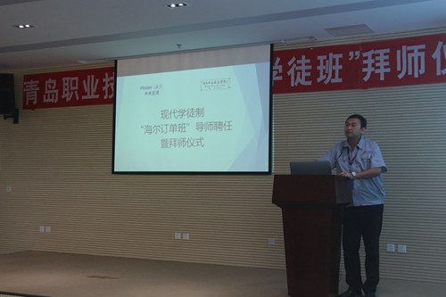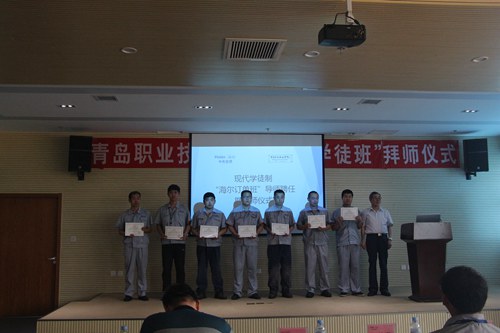 6月23日,海尔学院在海尔中央空调互联工厂举行制冷与空调技术专业“海尔现代学徒班”导师聘任暨拜师仪式,正式启动了2016级制冷学徒班的第一阶段学徒培训工作。学院副院长孔宪思、青岛海尔空调电子有限公司杨伟欣部长出席活动,青岛海尔空调电子有限公司胡建杰部长、刘晓波部长、周春波等14位企业导师,海尔学院院长张明耀、副院长张云龙、制冷与空调技术专业负责人尹晓霞及相关教师、制冷与空调技术专业2016-2班学生参加了仪式。