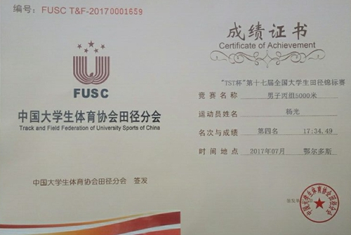 7月20日,由中国大学生体育协会主办,鄂尔多斯市人民政府承办的第十七届全国大学生田径锦标赛在内蒙古鄂尔多斯体育中心落下帷幕。比赛进行了6天12场,我院艺术设计专业的杨光同学,代表学院参加了丙组5000米的比赛,经过与28名参赛选手的奋力争夺,取得第四名的好成绩。