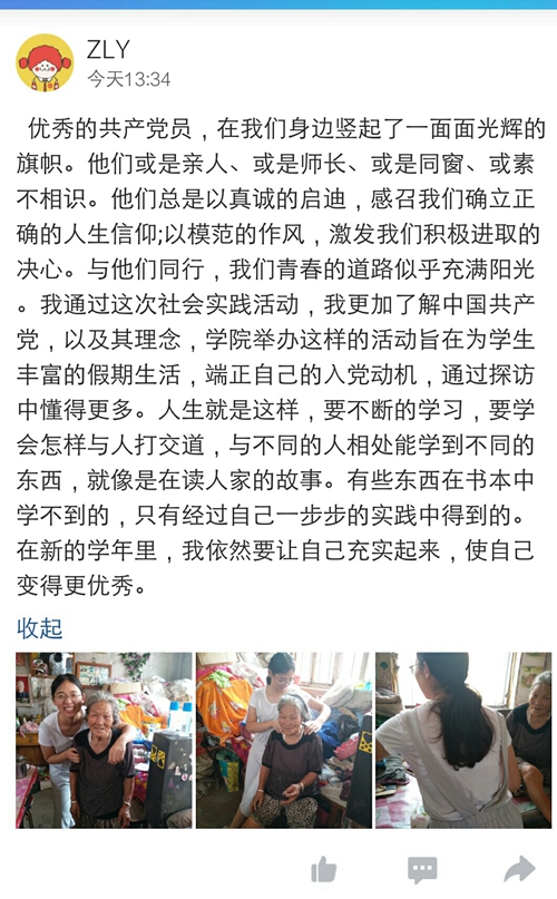 此次活动不仅是一次对老党员进行关心帮扶的社会实践,也是一次生动的党课,有利于同学了解党史,坚定永远跟党走的理想信念。