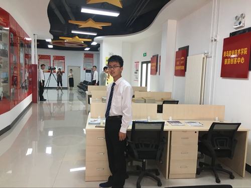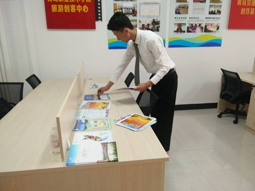 大学生礼仪社团许育玮同学与肖玉龙同学担任此次活动礼仪,负责引导参会人员参观等工作。旅游学院学生创客社团社长张鹏同学为与会人员作旅游创客分中心运行情况的介绍。为能更好地宣传我院,在活动开始前,在旅游创客分中心工作台上摆放了维多利亚vic003招生简章、旅游学院宣传册、青职国旅旅游线路等材料,便于向与会人员宣传。