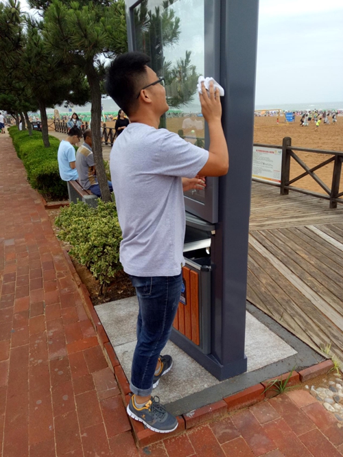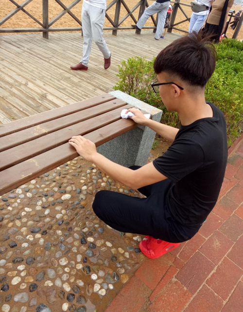 活动中,志愿者专门针对金沙滩附近的桌椅及广告牌进行了细致地清理。清理工作在有条不紊、热情高涨的氛围中陆续开展。桌椅和广告牌在志愿者们的努力下变得十分明亮、干净。志愿者们还在清理的同时向市民介绍环境保护的重要性。清理完成后,志愿者们请附近的环卫工人查看清理情况,获得了环卫工人和市民的一致好评。