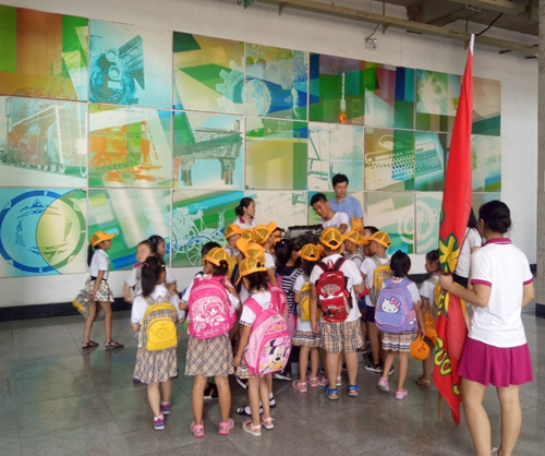 志愿者带小朋友们参观海尔学院实训基地