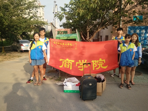 志愿者们利用开学前后学生整理衣柜的时机,在一楼大厅设置捐衣处,号召大家把不穿的衣服捐献出来,得到很多同学的响应。接着,志愿者们又到江西路小区开展了募捐活动,收到很多居民送来的衣物。志愿者把收集到的衣服送到旧衣服捐赠箱,助力公益。