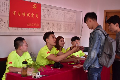 艺术学院学生党支部在迎新现场设立起了醒目的“有困难找党员”的党员先锋岗,学生党员亮出身份,为师弟师妹们提供各种热心的咨询和帮助,发挥学生党员的模范带头作用。现场学生党员还为新生讲解入党相关知识。