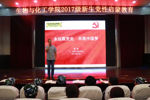 9月20日晚,生物与化工学院党总支书记邵凯在艺术厅为509名2017级新生开展党性启蒙教育讲座。