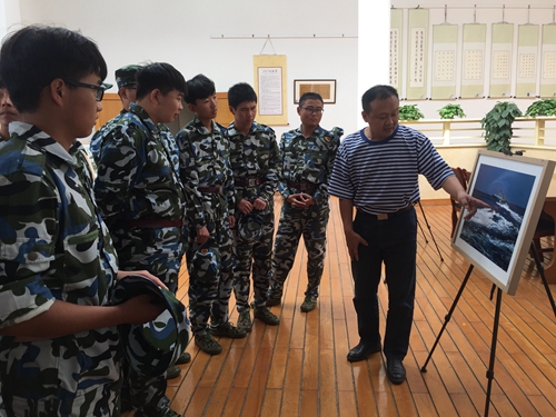 讲师团成员、原海军石家庄舰政委林风谦担任摄影展讲解
