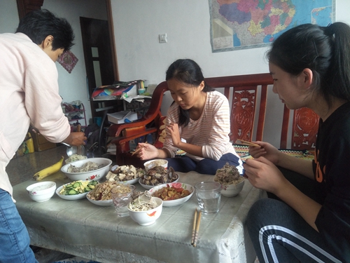 同学们随后来到别鑫宇家,他们的到来使别鑫宇一家非常开心,鑫宇的弟弟高兴地吃着同学们带来的零食,鑫宇妈妈则忙前忙后与社员们一起动手准备午餐,大家品尝着香喷喷的饭菜,家的温馨布满了整个房间。
