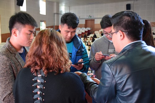 主题欢迎活动结束后,全体参会人员到学校图书馆前合影留念,并分组参观了学院T—Garden、闻道楼教室、教师笑脸墙、优秀校友墙等校内场所。,下午,在图书馆二楼西厅举办了师生情座谈会,日语专业的部分校友参加了座谈,李明杰、日语专业2004级辅导员老师张晓娜参加了座谈会,校友们就自己的工作、对母校的建议、对学弟学妹们的建议、自主创业情况等进行畅谈。