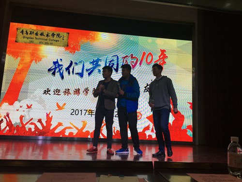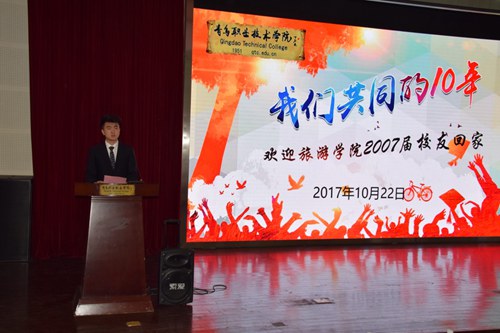 活动由主题活动、新老班级结对、合影留念、参观校园、师生座谈等版块组成。首先开始的是“我们共同的十年”——欢迎2007届校友返校主题欢迎活动,活动在艺术厅举行。活动以2016级学生林旭原创歌曲《遇见青职》开场。李成代表旅游学院全体教师向返校的校友表示欢迎,向校友们介绍了学院和旅游学院自毕业生毕业后十年来的变化和取得的成绩,分别从专业建设、师资队伍建设、王伟欢等优秀校友代表事迹、学院办学条件变化、国际合作办学、取得的荣誉等方面介绍。随后,旅游学院学生会主席王坤同学发言,他代表旅游学院全体在校学生对返校的校友表示热烈的欢迎,并表示在校生将以本届优秀校友王伟欢为学习榜样,刻苦学习,不断提升自身素质,回报社会。2007届校友代表威海久久大厦客房经理酒店管理专业谷璐飞发言,她对母校、老师们的培养表示感谢,感慨于学校10年的巨大变化,为母校取得的荣誉而骄傲,期待母校的未来更加美好。活动中,首届全国职业院校师生礼仪大赛团体一等奖获奖团队表演了礼仪操,传统礼仪一等奖获奖者表演了中国,淑女学苑社团表演《茶韵花音》节目,在校生的表演赢得校友们的阵阵掌声。最后一个环节,举办新、老班级结对仪式,酒店管理专业2004级一班、二班分别与2017级酒店管理一班、二班、三班结对,建成友好班级,新生班长、老生互扫二维码,留下联系方式,以便新老生之间可以更好地交流。校友们对学院、老师和在校生们精心准备的庆祝活动表示感谢。