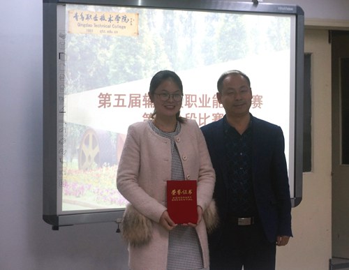 思政部主任宋辉为一等奖获奖者海尔学院辅导员隆娜娜颁奖