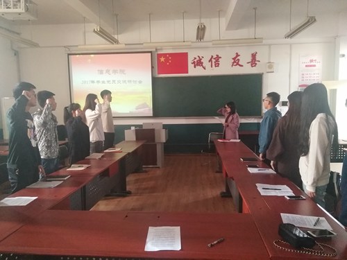 会上,首先全体预备党员根据十九大报告内容发表了自己的观点。同学们纷纷肯定五年来国家的飞跃发展以及切身感受到的美好变化。随后,大家以近期广受欢迎的电影《战狼2》中的“爱国主义与牺牲精神”为主题进行了热烈讨论。讨论中,党员们积极参与、踊跃发言,他们纷纷表示,从电影中可以感受到中国在国际上的地位日益提升,激起了自身的民族自豪感和自信心,作为一名预备党员要时刻自省自身的责任。会议最后,全体预备党员签下了《党员承诺书》并在雷慧昱的带领下重温入党誓词。
