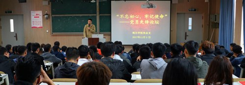 11月9日下午,海尔学院党总支“不忘初心,牢记使命”党员先锋论坛活动在修能楼举行。海尔学院党总支书记费晓玉、党总支副书记潘乐、学生党支部书记孙永翠、团总支书记隆娜娜,海尔学院学生党支部全体师生党员以及海尔学院第51期入党积极分子参加了论坛活动。