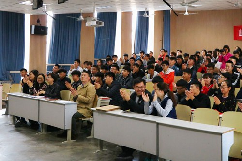 潘乐以党的十九大代表、青岛港有限公司大港分公司装卸二队副队长皮进军的先进事迹为切入点,勉励同学们向优秀共产党员学习,创先争优,勇争一流,志存高远,脚踏实地,以积极的学习态度和良好的精神面貌,勇做时代的弄潮儿。