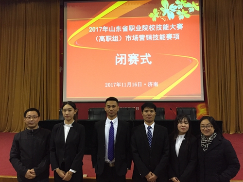 11月15日至16日,我院商学院市场营销专业师生参加了2017年山东省职业院校技能大赛,并在市场营销技能赛项中斩获第二名的好成绩。该赛项是由山东省教育厅、山东省经济和信息化委员会、山东省财政厅、山东省人力资源和社会保障厅、山东省农业厅等多部门联合举办的省级一类赛事。来自全省共47个院校的选手参加了比赛。经过两天的激烈角逐,我院市场营销专业侯凯旋、王广玉、张晓月、曹亚茹4位同学组成的团队在商学院龚成洁、李琴两位教师的指导下,最终以97.90分的高分获得第二名(与第一名仅差0.1分),取得了我院学生参与该项赛事的历史最好成绩。
