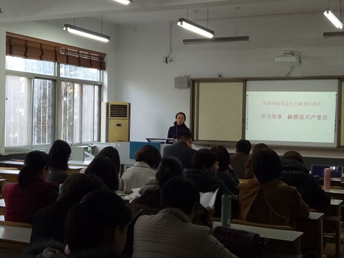 11月24日,旅游学院党总支组织4个党支部共40多名党员教师在闻道楼教室开展了以"学习党章做模范共产党员"为主题的主题党日活动,学习新修订后的党章。学习活动由旅游学院党总支书记李明杰主持。