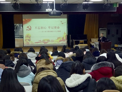 讲座中,宋辉首先介绍了外媒对十九大的高度评价,并对十九大报告“不忘初心,牢记使命”的主题进行讲解。随后,他着重就中国特色社会主义进入新时代以及习近平新时代中国特色社会主义思想的丰富内涵等十九大报告的具体内容进行了深入分析。最后,他激励同学们努力学习、积极向上。