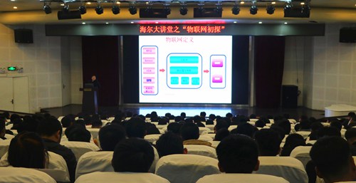 11月27日下午,海尔大讲堂如期在艺术厅举行,海尔学院王美平副教授主讲题为《物联网技术初探》的主题讲座,海尔学院2017级全体学生参加讲座。