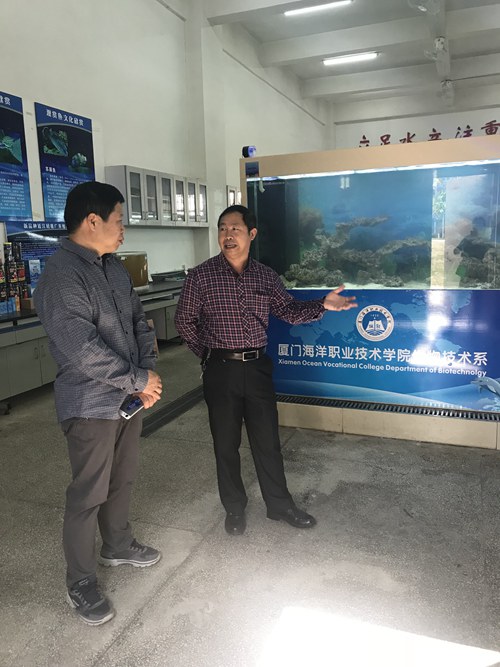 培训结束后,我院教师又赴厦门海洋职业技术学院进行考察学习。我院教师与生物技术系主任李碧全教授及相关专业的专任教师进行了座谈、交流,双方就水产养殖技术、食品营养与检测、水族科学与技术等专业的人才培养、专业教学、招生就业、校企合作、协同创新中心等方面进行了深入交流和探讨,并参观考察了嘉庚生物技术实训中心、观赏鱼实训室、海洋生物博物馆等场所。