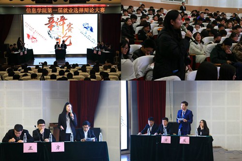 12月6日晚,信息学院在学院艺术厅圆满完成了第一届就业去向选择大赛决赛。旨在为丰富同学课余生活,活跃校园气氛,开阔学生眼界,培养学生生涯规划意识,树立正确的择业就业观。此次大赛的辩题为“毕业就业去向选择,你更倾向于高大上的北上广深,还是机会更多的小城市?”经过历时一个月,28个班级参与了初赛选拔。决赛中,对阵双方是大一 的“万夫不当”队对阵大二的“高大上”队。信息学院党总支副书记白杭,教师代表贾涛、宋海鹰、肖彤参加此次辩论赛决赛。2017级全体及部分2016级学生到场观看了比赛。