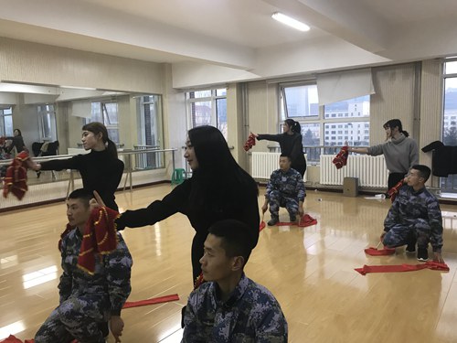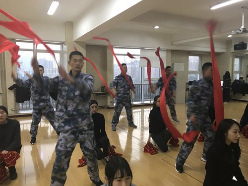 1月16日,教育学院2017级学前教育专业学生们配合青岛小口子基地海军部队的战士们完成了2018年部队新春汇演的舞蹈排练工作。