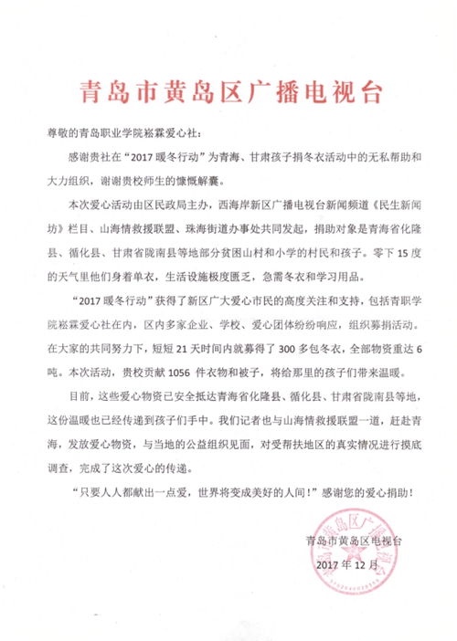 1月18日,黄岛区广播电视台向崧霖爱心社送来感谢信,对我院崧霖爱心社在“2017暖冬行动”为青海、甘肃孩子捐衣活动中的帮助和付出以及我院全体师生的慷慨解囊表示感谢。