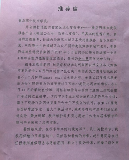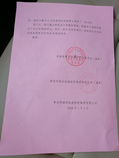 1月19日,共青团青岛西海岸新区委员会、青岛西海岸旅游投资集团有限公司联名向我院发来一封推荐信,信中对我院旅游学院旅游管理专业2016级2班赵兰慧同学进行了高度评价。