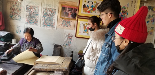 当天下午,同学们到达杨家埠,来到年画大王、国家级非物质文化遗产传承人杨洛书家中,对杨洛书工作室进行了参观,现场观看了杨家埠木板年画的印刷过程,向印刷师傅们讨教了年画的具体制作方法和流程,所有成员都惊叹传统手工艺人技艺的精湛和传统手工艺品的博大精深。