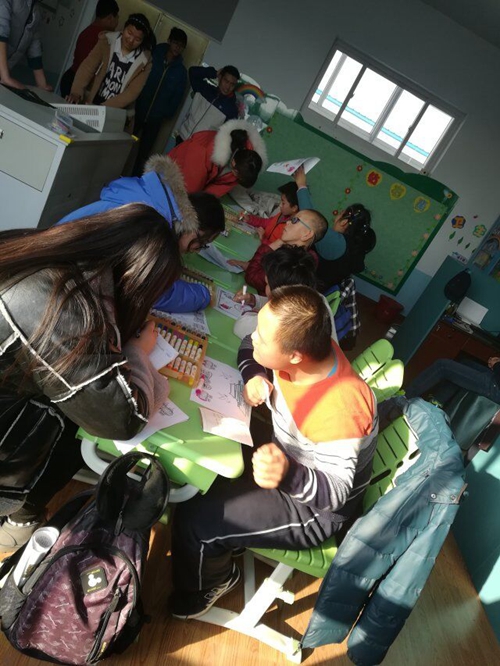 25日,志愿者们前往聋哑学校开展义务支教活动。志愿者利用自己的专业特长跟聋哑学校的孩子们开展了丰富多彩的活动,教孩子们画画、给孩子们讲故事。交际舞协会的志愿者们给孩子们表演了舞蹈节目,并教授他们一些简单的舞蹈动作。