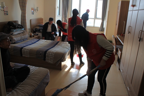 志愿者为老人房间打扫卫生
