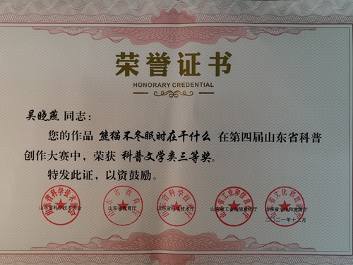 本届大赛由山东省科学技术协会、山东省教育厅、山东省科学技术厅、山东省工业和信息化厅、山东省文化和旅游厅共同主办。大赛中,旅游学院师生携手、同场竞技,通过专家评审、结果公示,教师李涛的作品《金色鳞片》、《“我的动物朋友”系列科学童谣》分获大赛科普出版物类二等奖和科普文学类二等奖;2019级学生孔娣作品《蜜蜂与“向日”葵》、学生王朝阳作品《条形码的意义》、学生吴晓燕作品《熊猫不冬眠时在干什么》分获大赛科普文学类三等奖。