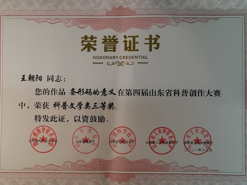 学生王朝阳获科普文学类三等奖