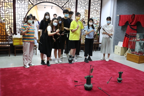 活动涵盖观看端午宣传片、古诗词朗诵、知识竞答、香囊制作、投壶体验等内容。端午知识竞答活动现场气氛轻松活跃,学生们抢答积极,寓教于乐。图书馆工作人员谭军讲解了香囊的制作方法,师生们一起亲手制作完成一款漂亮的粽子香囊,体验端午传统习俗文化的魅力。投壶游戏既新颖又有意义,学生体验古时雅礼,活动现场洋溢着浓浓的节日氛围。