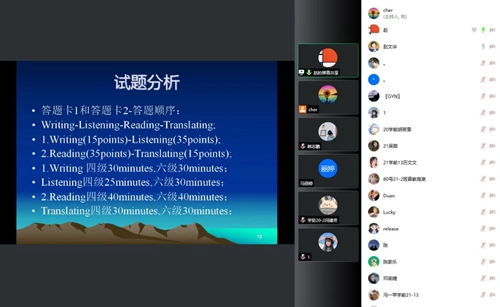 培训中,赵善青首先介绍了英语相关的考试、比赛、学习资源等,帮助学生们全面认识英语学习。随后,赵善青围绕考试流程、考试内容、答题技巧等,逐项详细讲解了听力、阅读、写作等考试部分。她在培训过程中对政策文化热点进行了分析,对用词语法结合案例进行了讲解,对考试书写等规范进行了要求,对以往考试中常出现的问题进行了总结,结合学生前期提出的问题进行集中反馈及个性化辅导。教育学院教学工作负责教师对学生们开展了四六级考试的防疫安全及诚信教育,要求学生严格按照各项考试规范,有序、诚信参加考试。