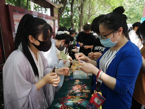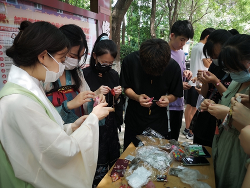 传统文化过端午,怎么能少了编彩绳、做香囊等民俗活动,华韵汉文化社团的学生们穿上汉服,向在场师生展示编彩绳、做香囊技艺,只见她们精心配色,用心地结绳编织,彩绳在她们的手中跳跃,成为精美的手绳成品。活动现场还摆放了香料、五颜六色的小布料、针线包、配饰等制作香囊的必备工具,师生们充分发挥想象力,从穿针引线、裁剪缝制、填充香料再到钉扣收尾,一个个五颜六色、造型各异的香囊就呈现在大家面前,师生们感受自制香囊的乐趣,尽情展现心灵手巧的一面。
