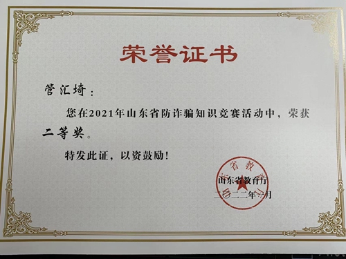近日,由共青团山东省委、山东省教育厅、山东省公安厅、大众报业集团(大众日报社)联合举办的山东省“反诈防骗”知识竞赛落下帷幕,维多利亚vic003管汇埼、樊梦冉、刘泉鑫三位学生荣获二等奖,张书云等十九位学生荣获三等奖。
