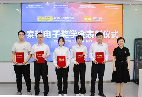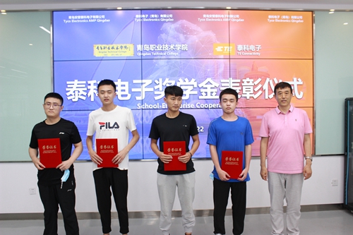 2021年10月,青岛安普泰科电子有限公司、泰科电子(青岛)有限公司共同为海尔学院捐赠奖学金10万元,用于奖励在企业顶岗实习中表现优秀的学生和品学兼优的在校生。经过校企联合评选,此次共有2019级8名学生获得“实习奖学金”、2021级10名学生获得“学习奖学金”,费晓玉和姜学林共同为获奖学生颁奖。