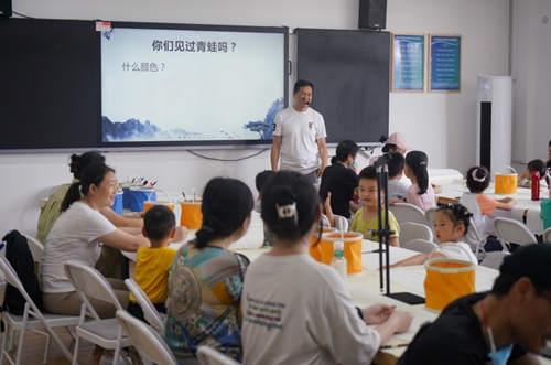 结合授课内容要求,本期活动主要面向6至12岁教职工子女开展。讲座中,黄柏岩结合孩子们的兴趣点和具体学情,从赏析国产优秀水墨画电影《小蝌蚪找妈妈》入手,通过示范演示,重点讲解了青蛙、蝌蚪和水草的水墨画法,以及简单的定格动画制作方法。在孩子们用毛笔绘画过程中,黄柏岩从旁示范指导,家长也认真聆听,帮助孩子共同完成水墨画作。2个多小时的时间里,孩子们绘画认真,家长参与度高,现场气氛热烈。
