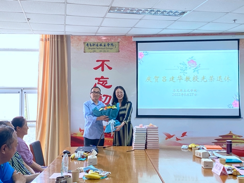 座谈会上,邢广陆为吕建华副教授送上荣休纪念杯和祝福花束,表达诚挚与美好的祝福。她表示,吕建华副教授在青岛职院的职业生涯,是学校发展历史在教师身上的缩影,代表学校对吕建华副教授精彩的职业生涯表示祝贺,对其为学校发展所做出的贡献表示充分肯定和衷心感谢。她希望大家学习吕建华副教授专心做事、任劳任怨、耕耘杏坛、不计得失的初心和使命,学习他对教育事业、对同事、对学生保持着充分的尊重和爱,也衷心祝福吕建华副教授科学合理安排好自己退休生活,一如既往地对学校的工作给予支持,拥有一个健康快乐、充实幸福的退休生活。
