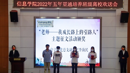 活动伊始,五年贯通班主任代表王宏涛发言,她希望即将走上实习工作岗位的学生们,传承初心,不负青春韶华,再铸人生崭新的精彩。李海民宣读了关于表彰“优秀班主任”的决定,李明杰为“优秀班主任”颁发荣誉证书。随后,信息学院党总支副书记李海民为“老师——我成长路上的引路人”主题征文活动中获奖的三位学生颁发了荣誉证书和奖品。