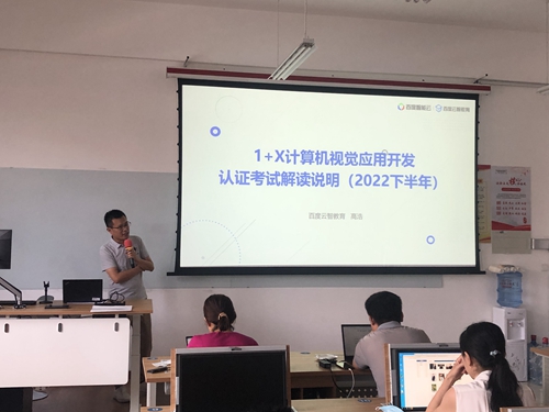 8月1日,信息学院副院长徐占鹏、百度云智教育解决方案架构师韩涛及教研经理高浩等出席开班仪式。徐占鹏介绍了信息学院人工智能专业建设现状、校企合作情况、实训基地建设等,韩涛介绍了百度在人工智能时代的职业教育与“课证赛训融通”机制,高浩详细介绍了百度“1+X”计算机视觉应用开发职业技能等级证书的最新考纲和实训平台。