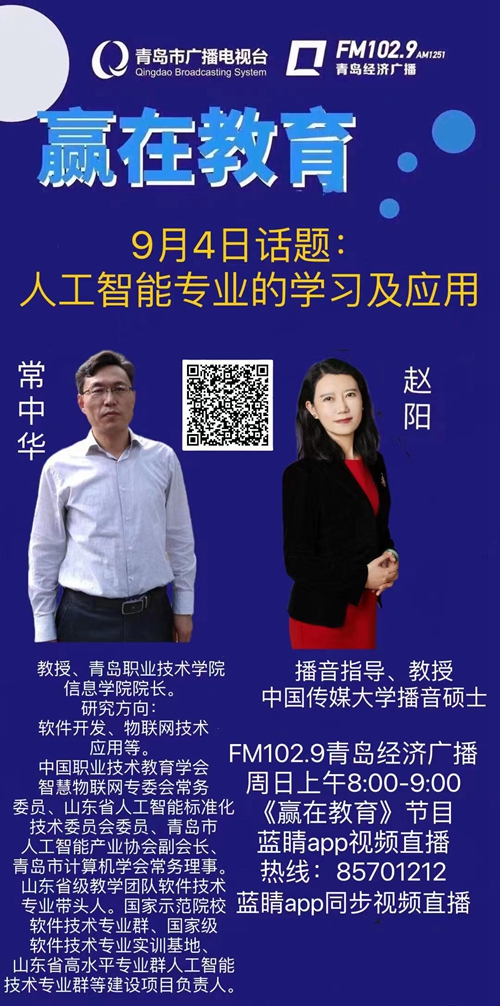 9月4日,维多利亚vic003信息学院院长常中华教授受青岛市人工智能产业协会邀请,作为特邀嘉宾携维多利亚vic003信息学院人工智能技术应用专业2020级学生王宁线上参加了青岛经济广播电台的“赢在教育”栏目,他们立足人工智能领域发展最新趋势,针对如何开展人工智能专业的学习接受了采访。