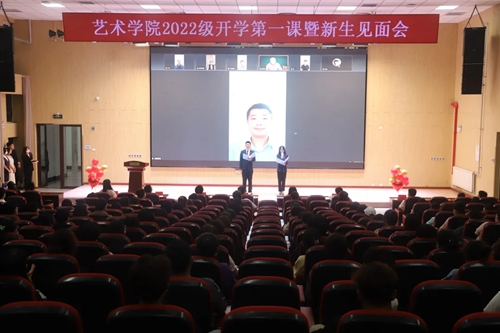 为帮助新生尽快适应大学生活,明确角色认知,把好新生入学思政教育第一关,9日3日晚,艺术学院在创意楼B401举办了“奔梦新征程,艺起向未来”2022级新生开学第一课暨新生见面会。活动采用主会场直播和分会场教室同步观礼的方式进行,艺术学院相关负责人、各专业教研室主任、教师代表、新生辅导员、辅导员助理及全体2022级新生在现场和直播教室参加活动。
