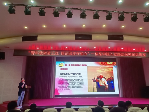 信息学院党总支书记李明杰从入党基本知识、廉洁知识、保密知识三方面作入党廉洁保密知识专题讲座,鼓励学生积极学习党的基本理论的同时也激励大家努力学习优秀党员模范身上的宝贵品质,用青春谱写中华民族伟大复兴的光辉乐章。
