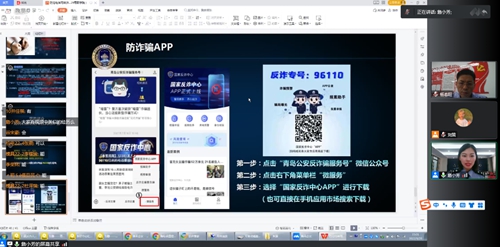 9月29日下午,海尔学院(青德学院)邀请青岛市公安局刑警支队反诈中心民警詹芳以线上线下相结合的方式开展防范电信网络诈骗犯罪知识讲座。海尔学院(青德学院)部分师生在报告厅、教室等分会场集中收看讲座。讲座由海尔学院(青德学院)党总支副书记杨春旺主持。