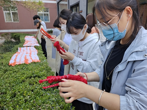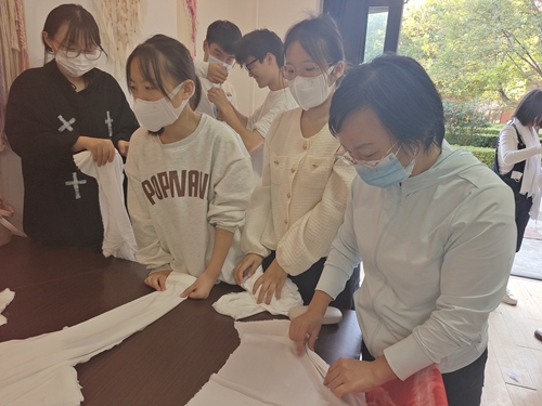艺术学院党总支副书记郭静与学生一起学习扎染技艺