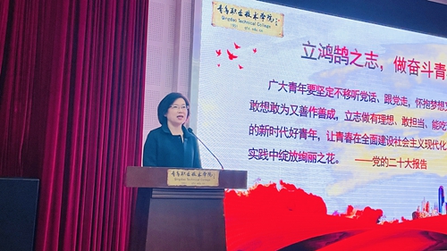交流会在一段短视频《七彩假期 情暖童心》中拉开序幕。费晓玉上台致辞,她以“立鸿鹄之志,做奋斗青年”为题,带领师生重温了习近平总书记在党的二十大报告中对青年的寄语,要求学生们牢记习近平总书记嘱托“要坚定不移听党话、跟党走,怀抱梦想又脚踏实地,敢想敢为又善作善成,立志做有理想、敢担当、能吃苦、肯奋斗的新时代好青年。”她列举了许多先进青年和优秀校友立足岗位、投身实践、热血报国的事迹,并就青年学生如何践行习近平总书记重要讲话精神提出了具体要求。