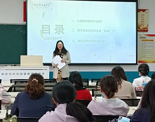 讲座中,尹海兰向专业教师介绍了学校心理咨询室的环境和功能,解读了国家心理健康教育相关文件政策,分析了学生会出现的心理健康问题,以及专业教师和辅导员应该从哪些方面进行适当的引导和干预,达到全方位呵护学生健康成长。