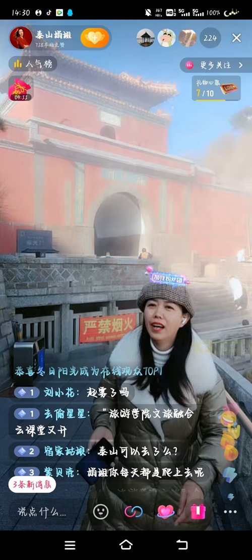 直播前,旅游学院制作并发布专题电子宣传海报,让学生扫描电子海报二维码进入“云课堂”。直播过程中,张娟通过抖音平台带领旅游学院师生“实境”游览了世界自然与文化遗产泰山。她以南天门为起点,以玉皇顶为终点,讲述了泰山在中华历史文化中的独特位置与意义。泰山上有历代人物登临所留碑碣、摩崖石刻2000余处,张娟沿途讲解了唐玄宗《纪泰山铭》、秦无字碑、五岳独尊等一系列碑碣刻石背后的故事,带领学生体验了泰山自然的雄伟与文化的深厚,直播过程中还恰逢“泰山云海”,让学生体验到了“五岳独尊”的独特气势与魅力。张娟还分享了自己在新形势下从传统导游向导游主播转型的历程与体会。